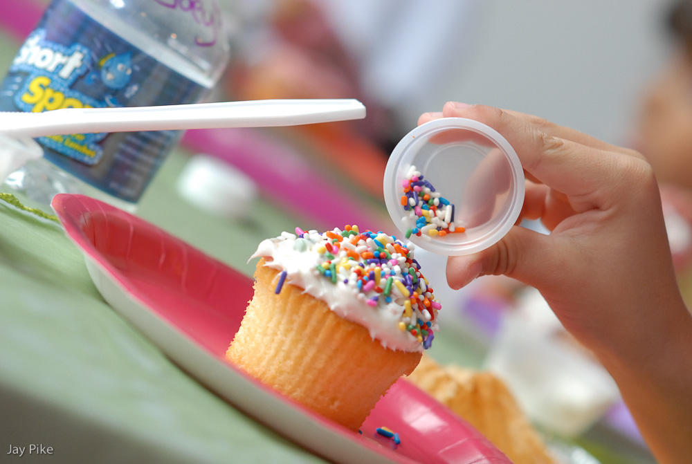 Nibbling on a piece of a PB-n-J sandwich, Jocie sits on the floor watching TV